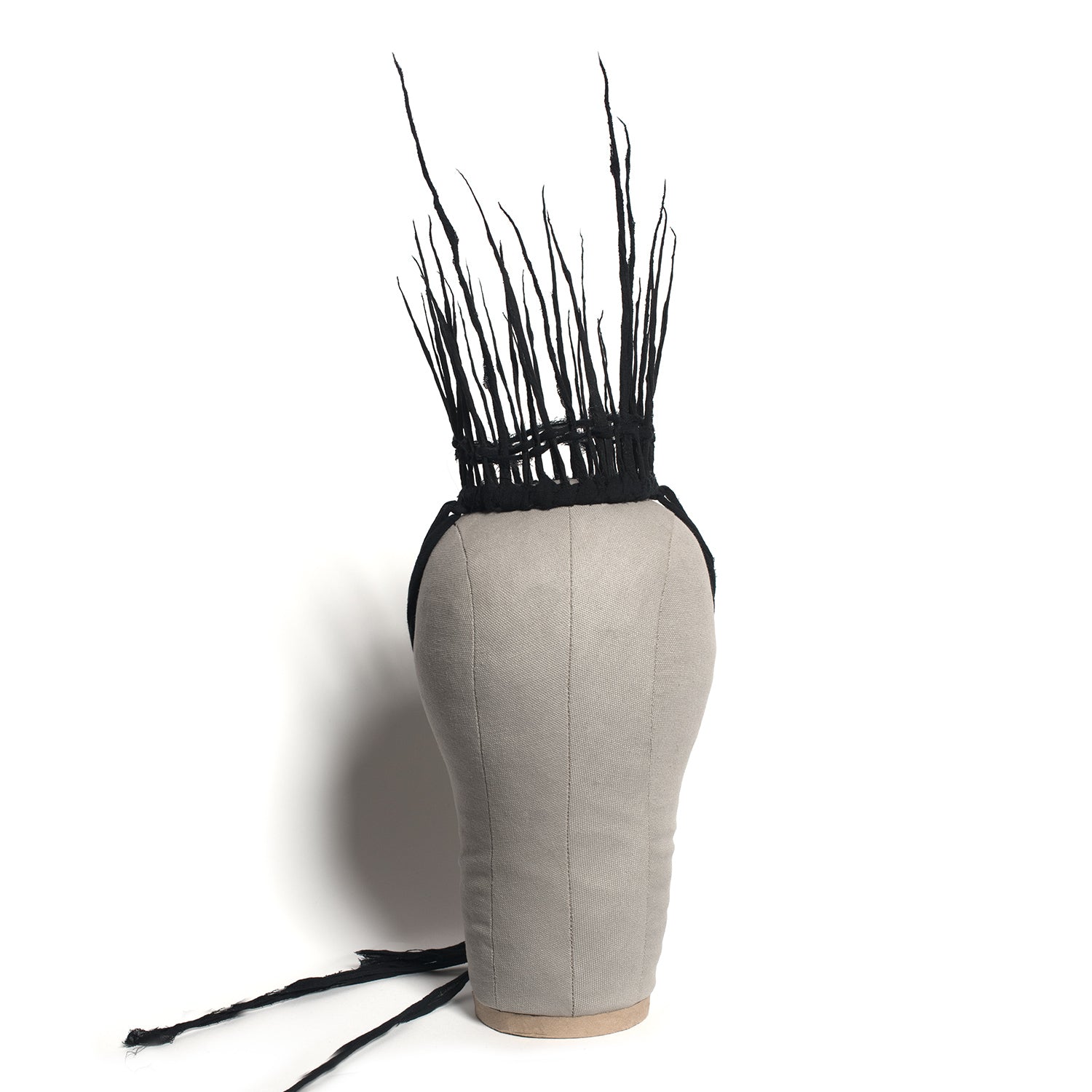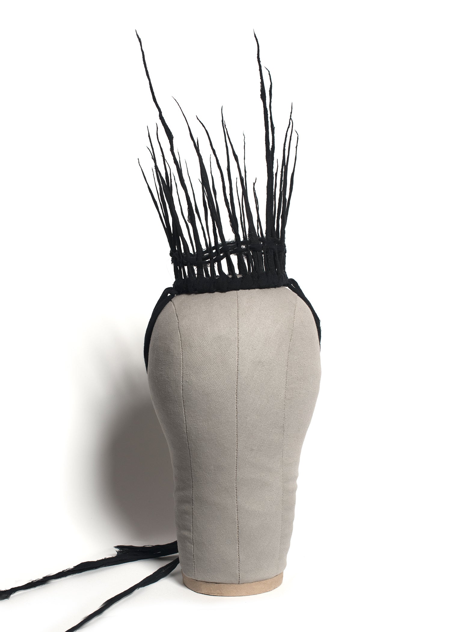 Light as a feather, this spectral, witchy, wraith-like mini crown is perfect for Gothic royalty. Entirely made out of stiffened gauze fabric. Ties in back with long gauze fringe ties.