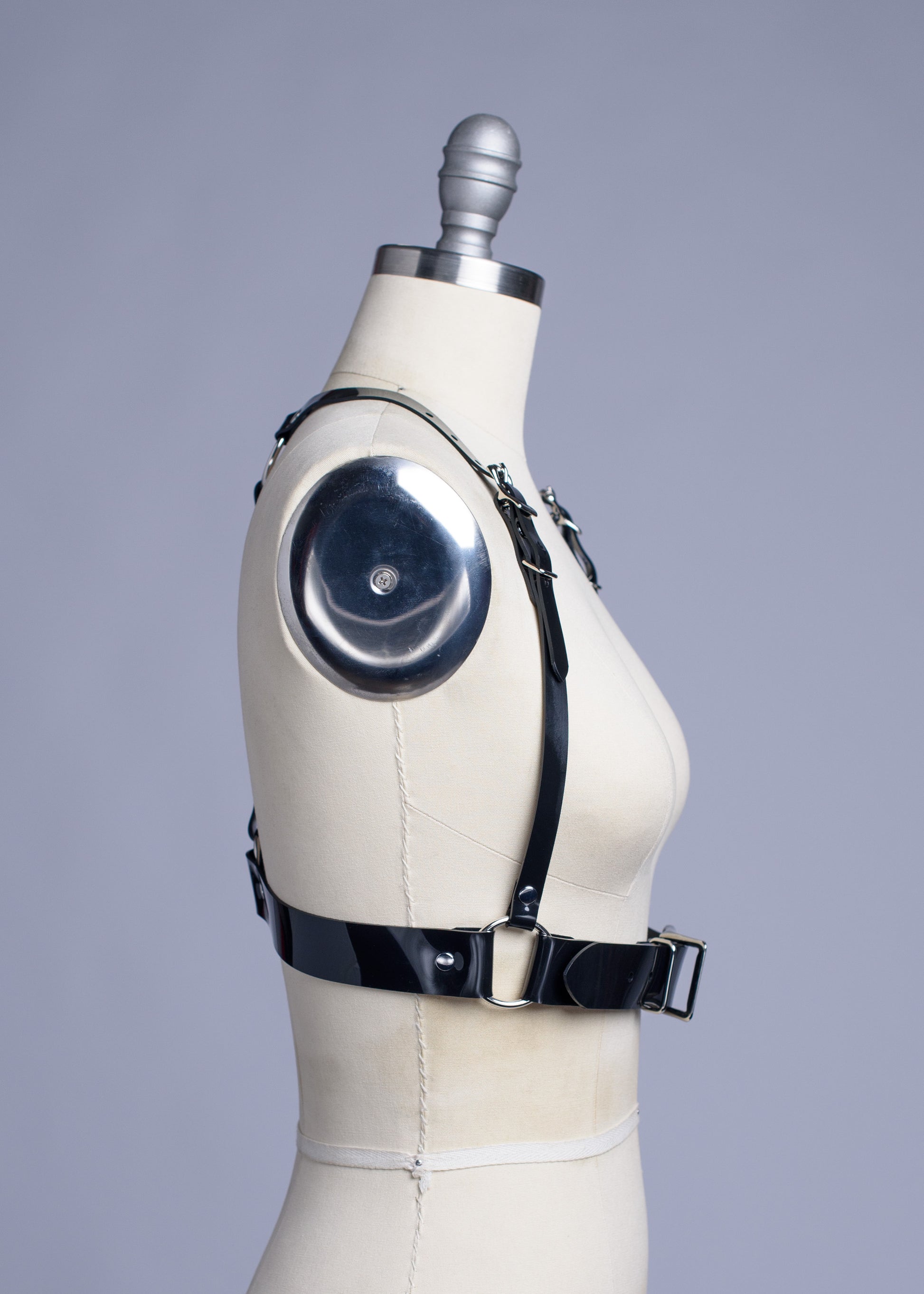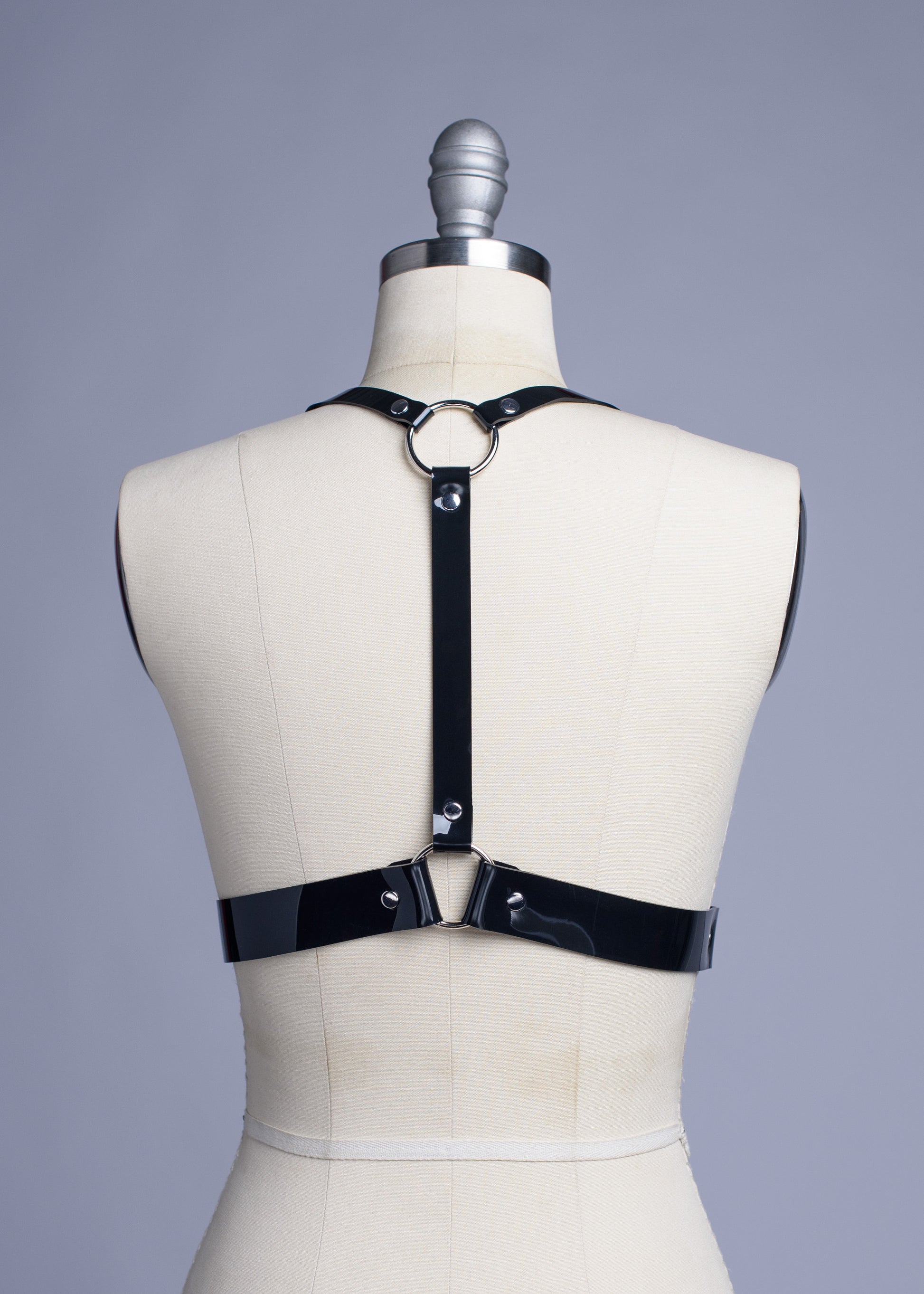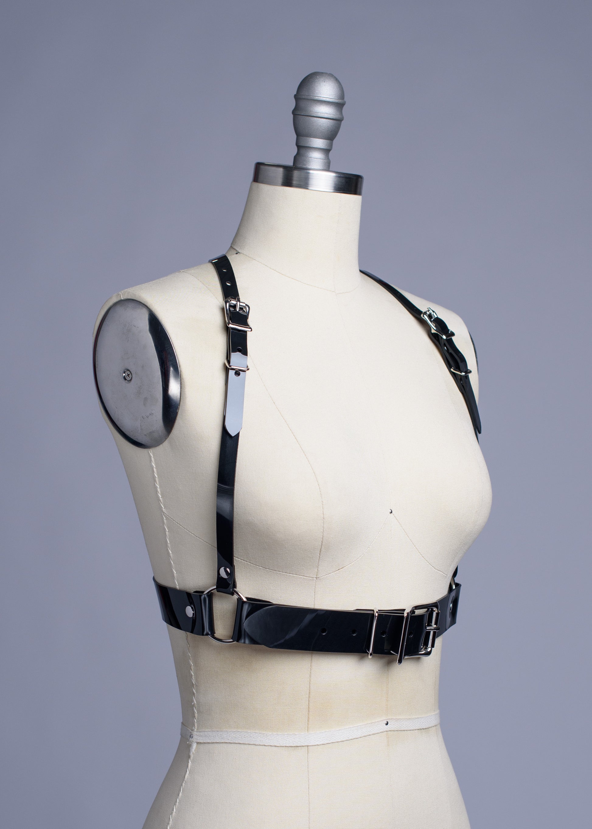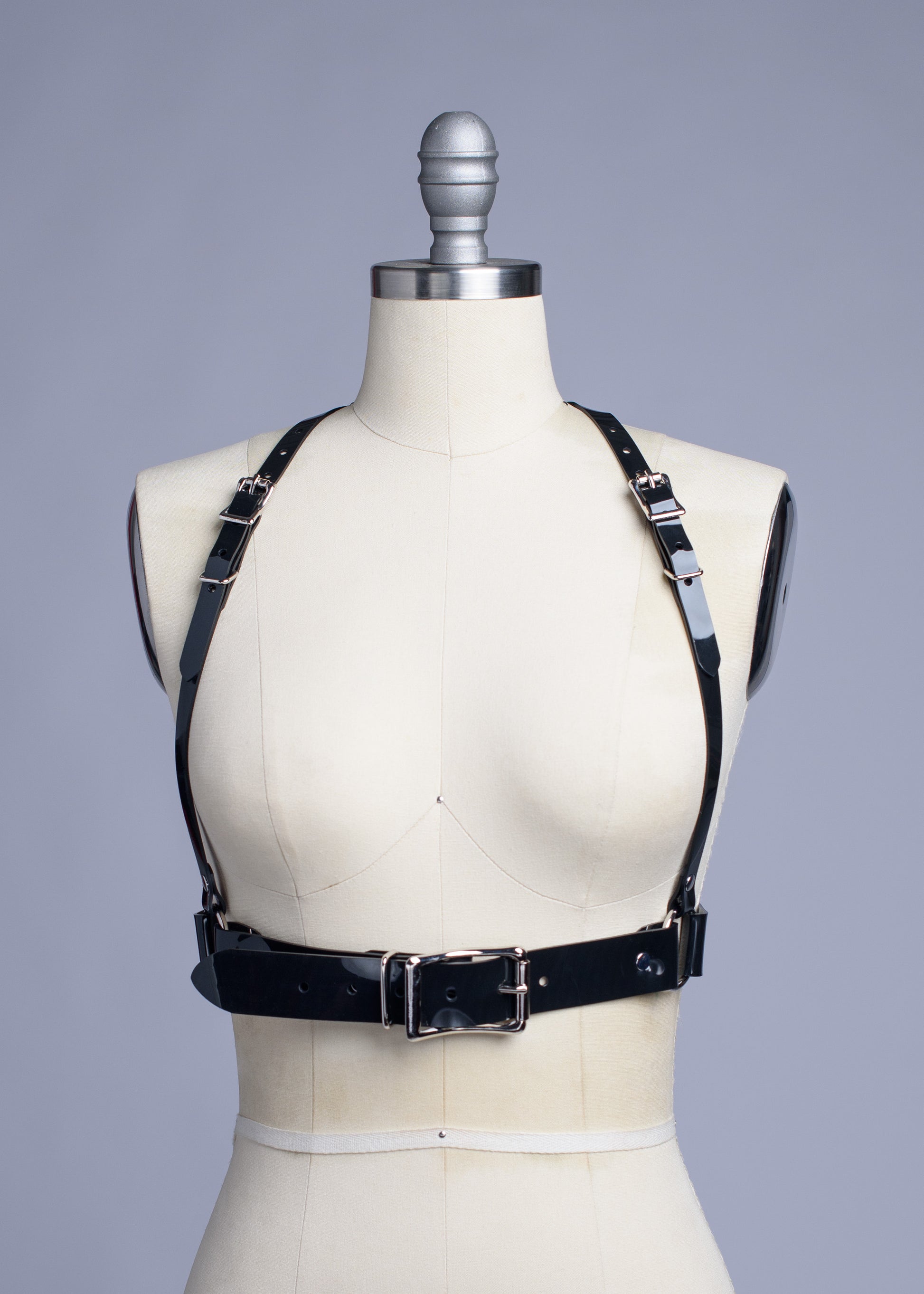 Classic underbust harness made in thick, strong PVC, vegan leather, or leather. Fit is adjustable with buckles and straps. Silver-toned nickel plated steel hardware. Similar to the original Multipass Harness, with wider waist straps and chunkier hardware.